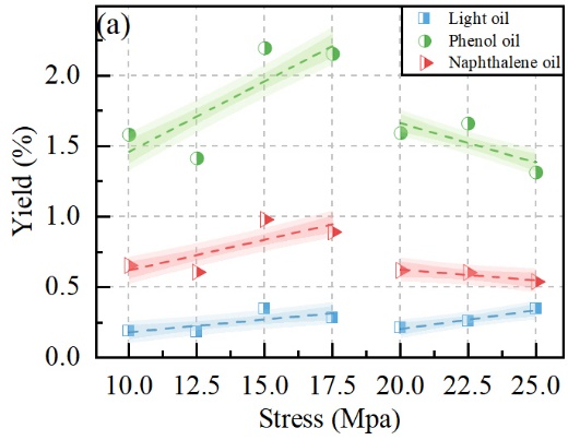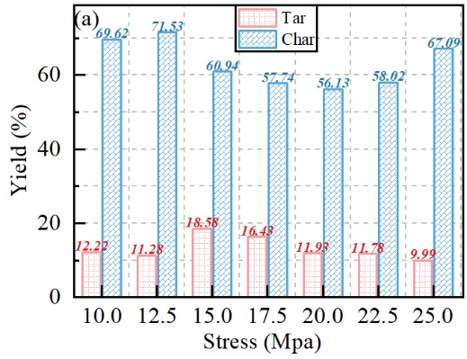 当应力升高至20.0-25.0MPa时,煤样热解产物的产率变化相较于10-17.5MPa呈现显著差异。具体表现为,半焦产率由56.13%增至67.09%,增幅为10.96%;焦油产率由11.93%降至9.99%,减幅为1.94%;煤气产量由115.96ml/g减少至89.66ml/g,减少量为26.3ml/g。随着应力值的增加,煤体孔渗明显下降,且孔隙间连通性较差,导致热解过程中较大挥发分的释放阻力增大,未能及时排出,停留时间延长,从而增加了二次缩合和聚合反应的可能性,进而引起半焦产率的增加,以及焦油产率和煤气产量的降低。