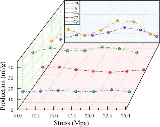 20-25.0MPa,各气体组分的产量与10-17.5MPa表现出截然相反的趋势,CO的产量随应力的增大逐渐增大,其余各类气体则逐渐减少。其中CO2产量减少13.668ml/g,CH4减少5.449ml/g,C2+烃类气体减少