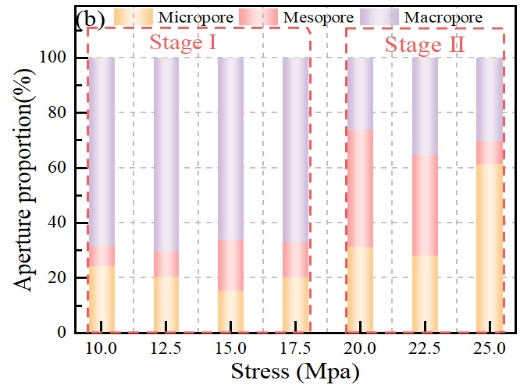 众多学者对孔径和弛豫时间的关系进行了深入研究,认为T2<3ms指示的孔隙属微孔,3ms<T2<170ms属中孔,T2>170ms属于大孔或裂缝。本研究基于此,分别计算了各煤样微孔、中孔和大孔的信号量,并通过与总信号量作比值,确定了不同应力约束下煤样各孔隙的孔径占比(图5b)。10.0-17.5MPa,各煤样的微孔占比整体偏低,中大孔占据着主导地位,占比达80%左右。此阶段,随着应力的逐渐增大,煤体逐渐发生裂解,孔隙间的连通性增强。这促进了热解过程中孔裂隙内流体对流传热效应,进而使得连通孔隙在热解过程中持续扩展,中大孔占比逐渐增加。这与孔隙表面形貌特征保持一致。在更高的应力范围下(20.0-25.0MPa),微孔占比从31.30%急剧增大到61.27%,几乎增大一倍。此应力阶段,煤体内的裂隙逐渐被压实,孔裂隙的连通性相应减弱,热解过程中孔裂隙对流传热作用亦趋减弱,连通孔隙的扩孔现象相应降低。与此同时,煤基质的热传导作用得到加强,导致煤基质中形成了众多相对较小的热解孔隙,微孔占比显著增加。
