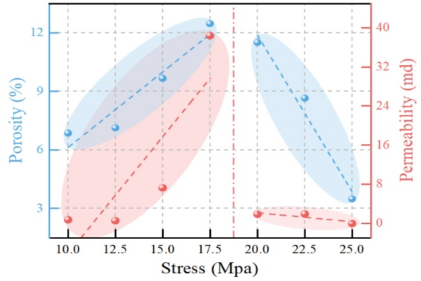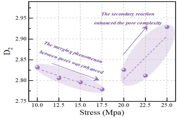 (1) 应力约束下孔隙结构的演化呈现明显的阶段性。10-17.5MPa,煤体逐渐被压裂,孔裂隙相互连通,热解时孔裂隙内流体对流传热增强,孔隙不断扩大,孔渗随之增大,分形维数减少。20-25MPa,煤体被压实,裂隙闭合导致孔裂隙连通性变差,孔隙内对流传热弱化,基质传热增强导致基质上形成了新的独立小孔隙,使得孔渗降低,分形维数增大。